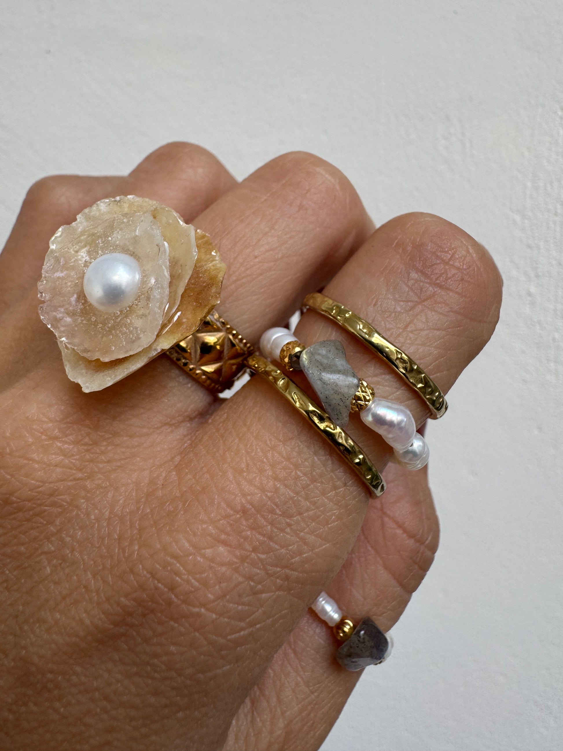 Bague en acier inoxydable doré – Labradorite & perles d’eau douce.