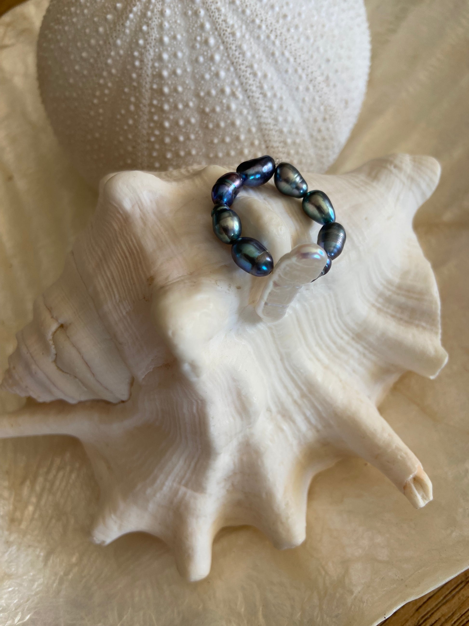 Notre bague surprenante Fila, au doux mélanges entre la puissance des perles d'eau douce Bleues Paon, et allié parfaitement avec la pierre baroque blanche en son centre.