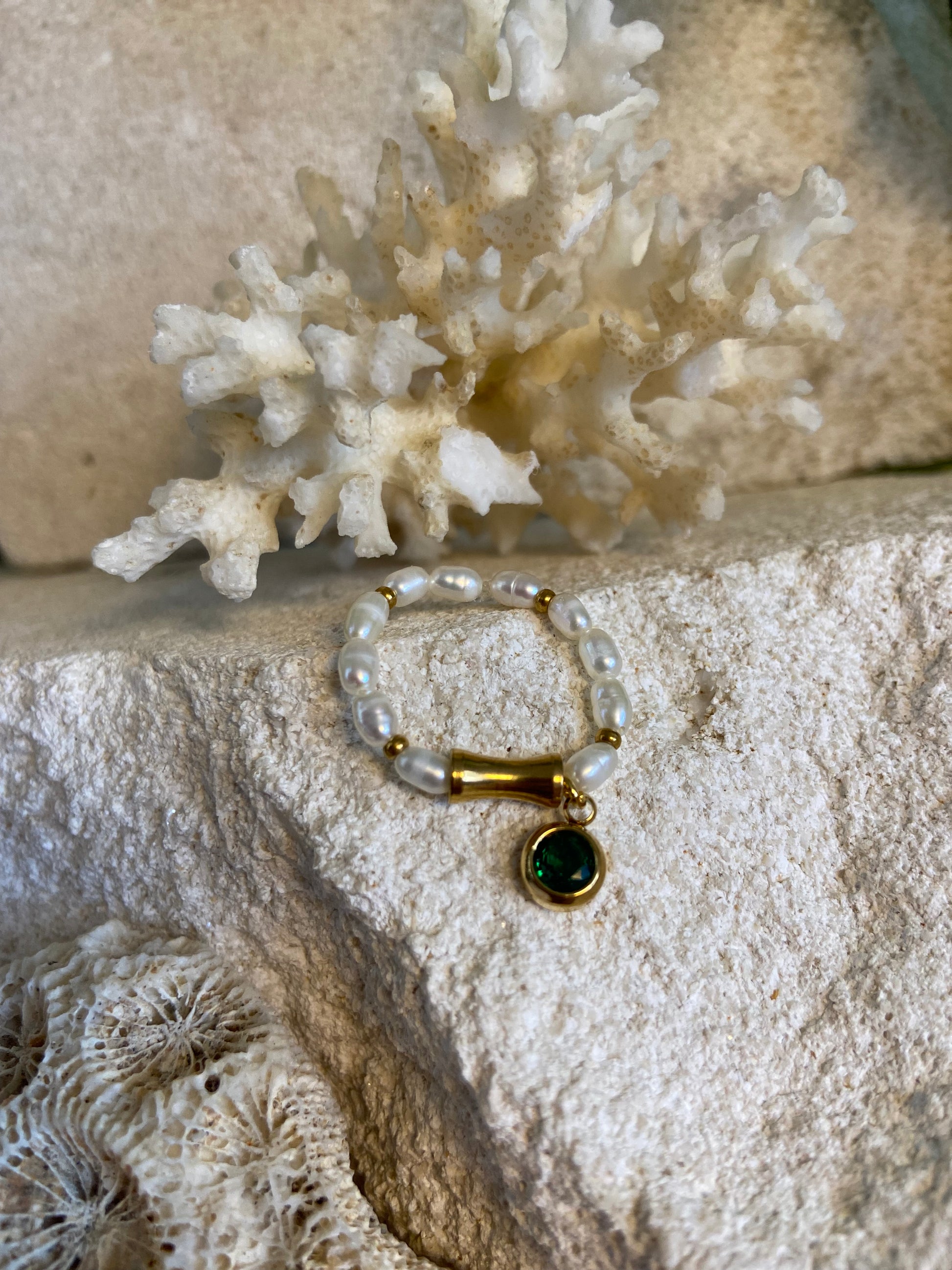 Et pourquoi pas porter une jolie bague aux couleurs printanières? Si c'est ce que vous recherchiez alors cette beauté est faite pour vous! Cet assemblage en perle d'eau douce et pendant en zircon vert saura faire sa place à votre doigt.