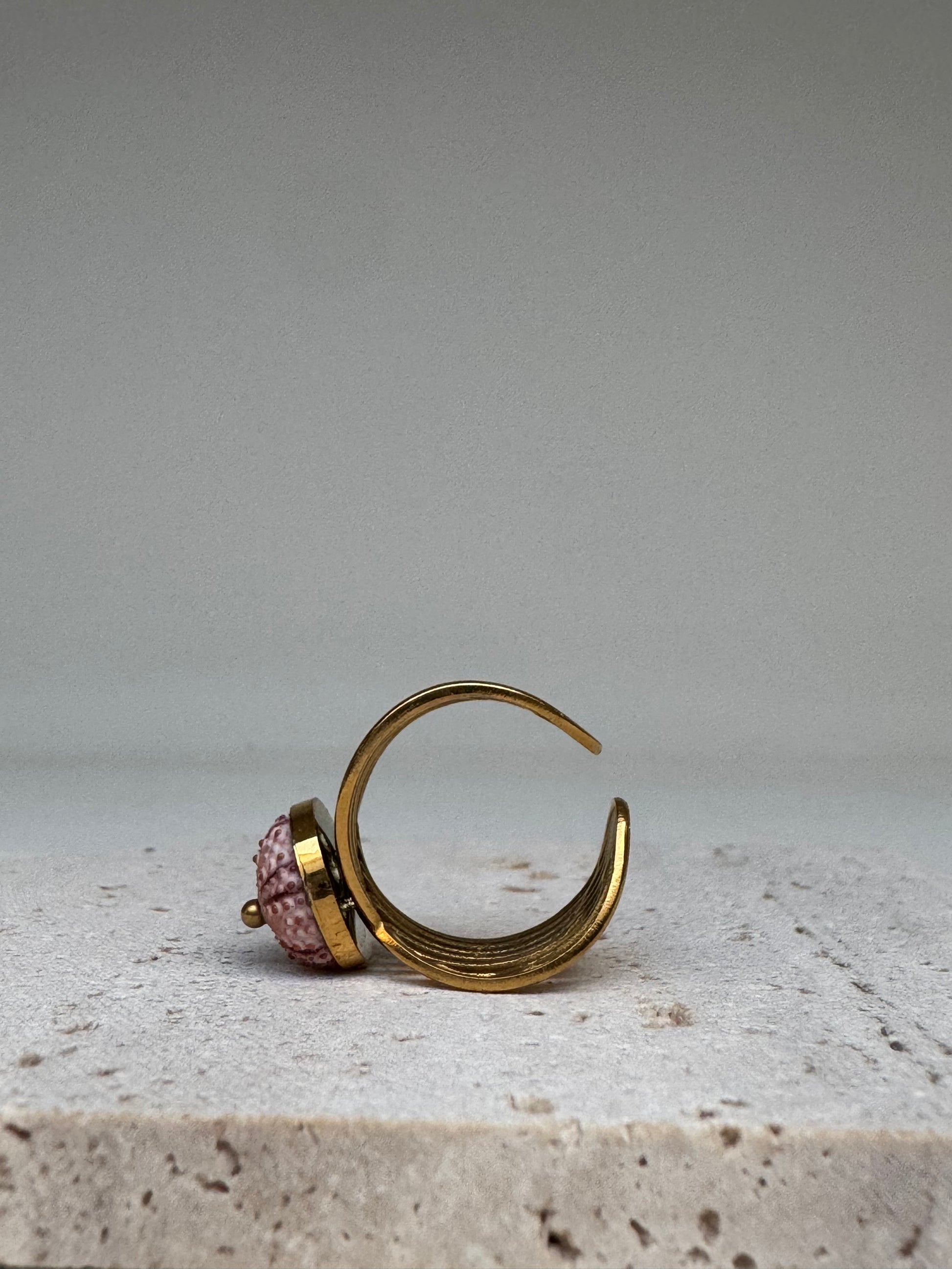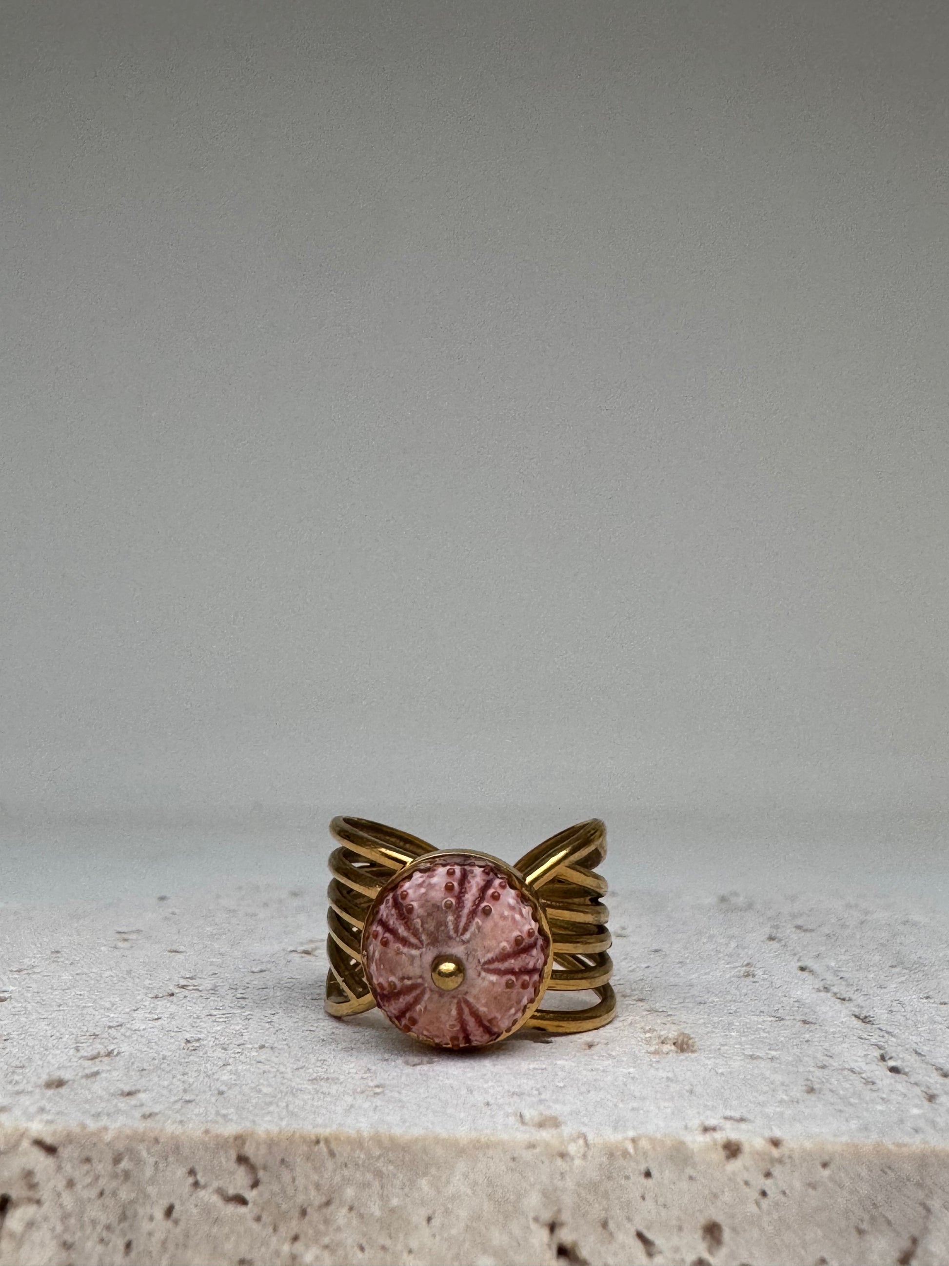 Laissez-vous séduire par cette bague au charme marin et raffiné. Son anneau doré ajouré, délicatement travaillé, met en lumière un oursin naturel aux nuances de rose poudré. Un bijou qui unit la force de l’océan et l’élégance intemporelle de l’or.
