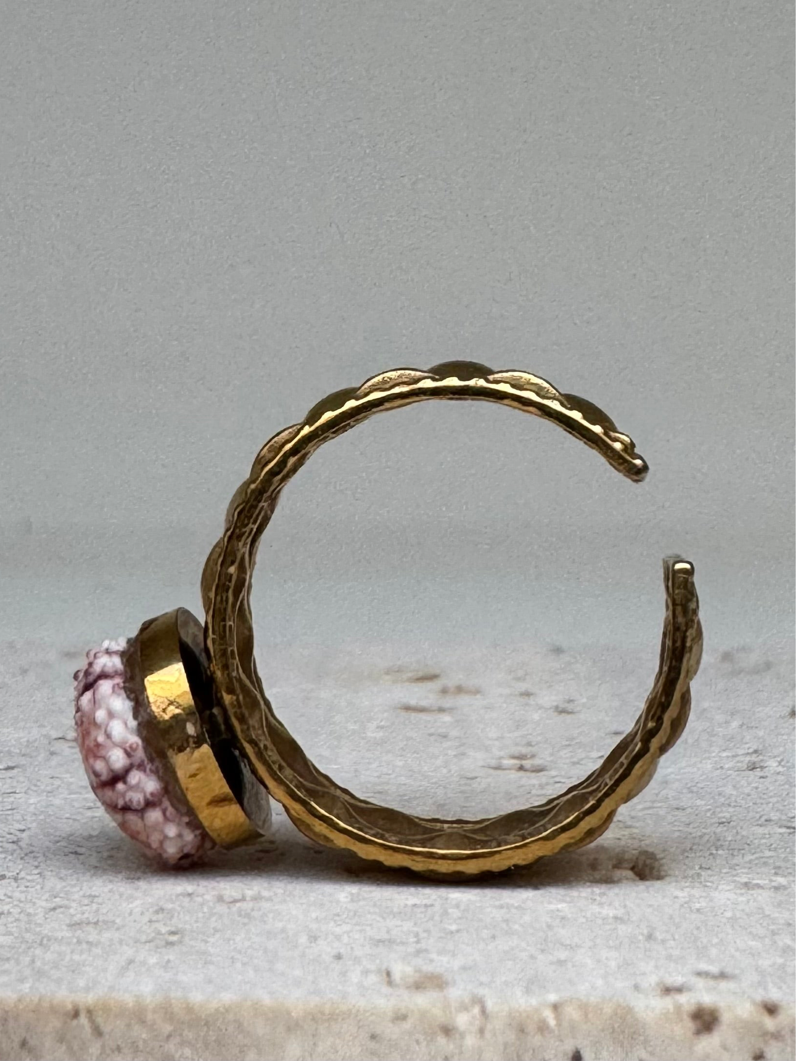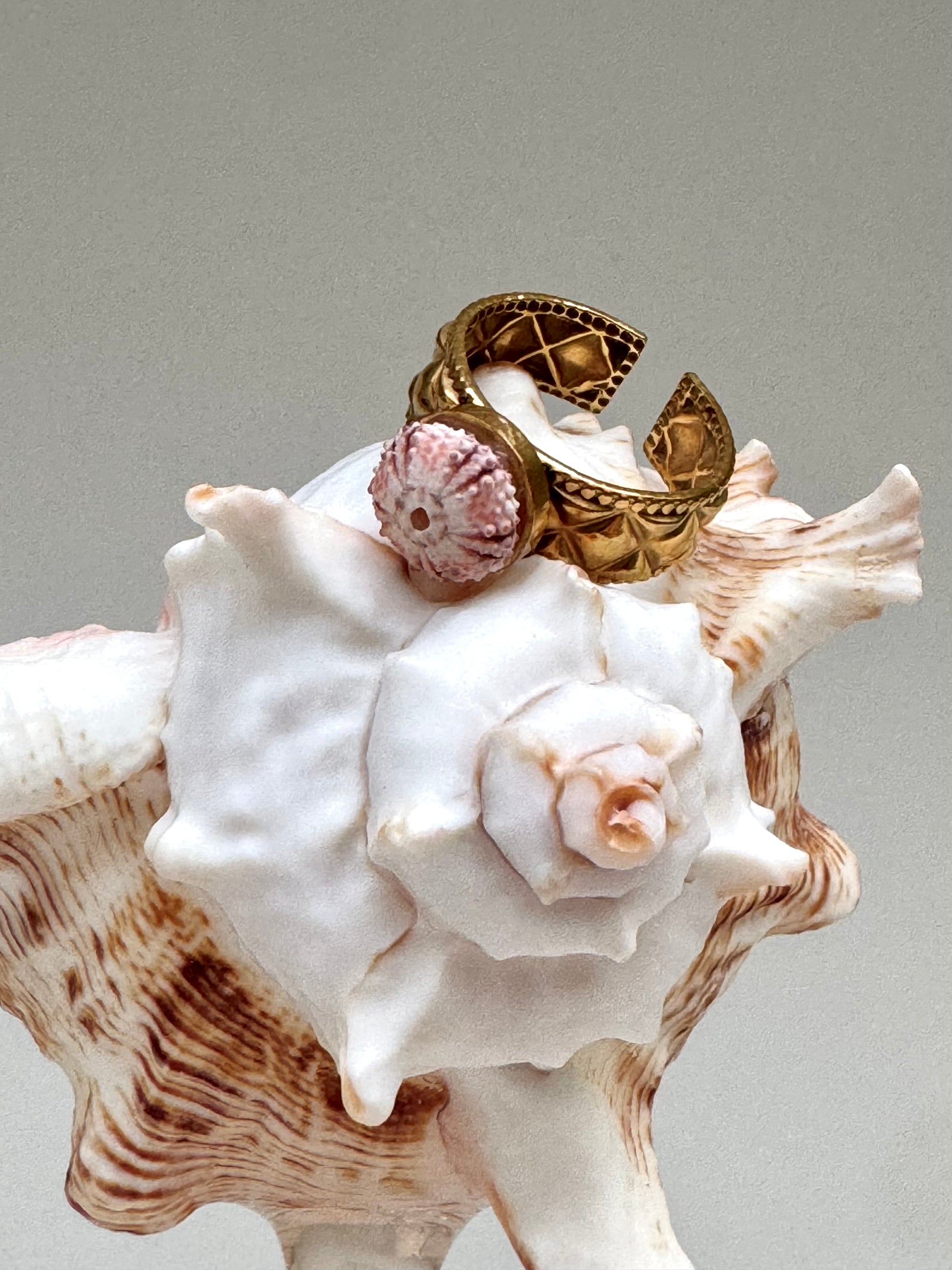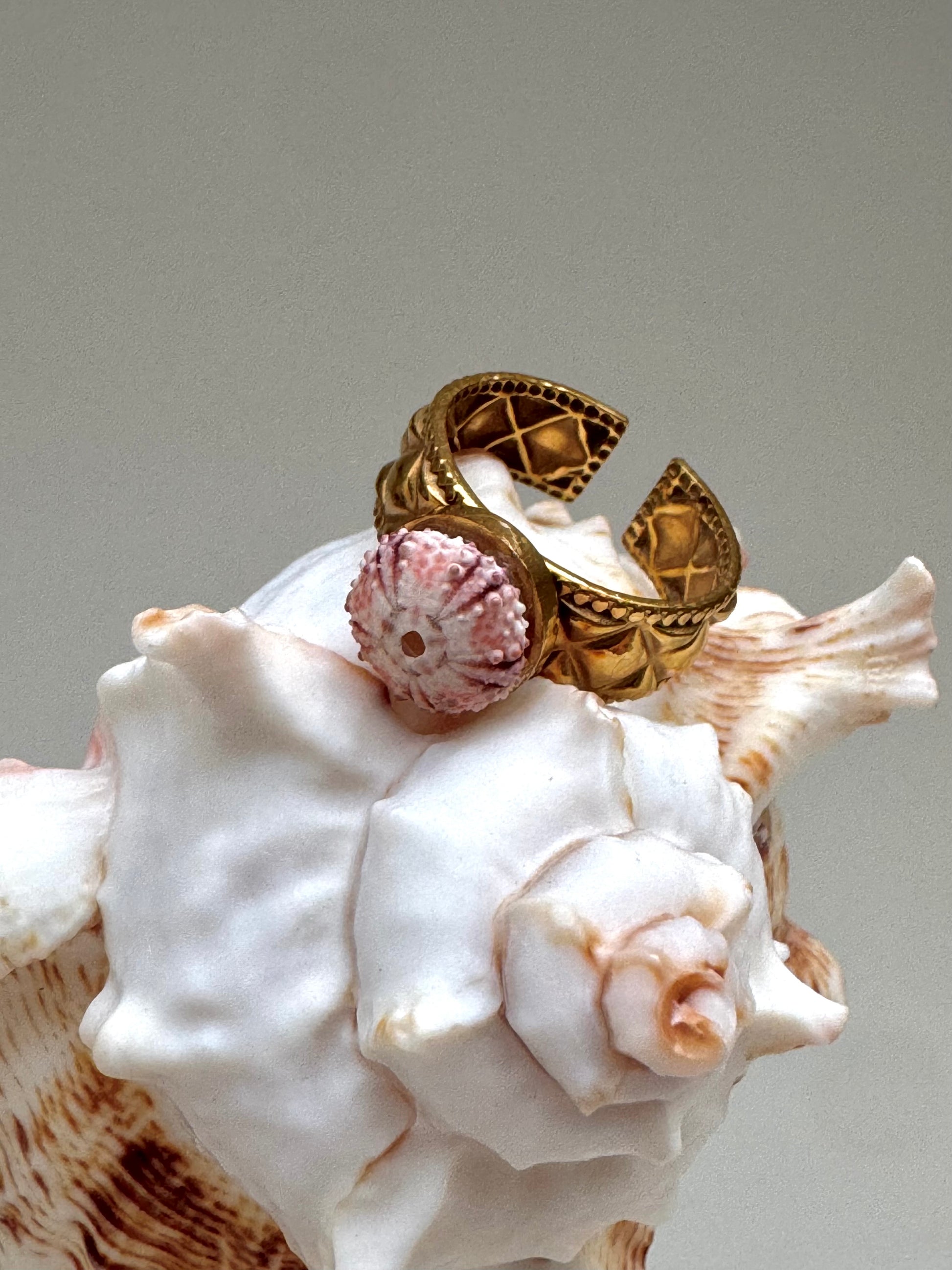 Apportez une touche d’originalité et d’élégance à votre style avec cette bague unique. Son anneau doré au design texturé et géométrique met en valeur un délicat ornement inspiré de l’oursin, aux teintes naturelles de rose et de blanc.