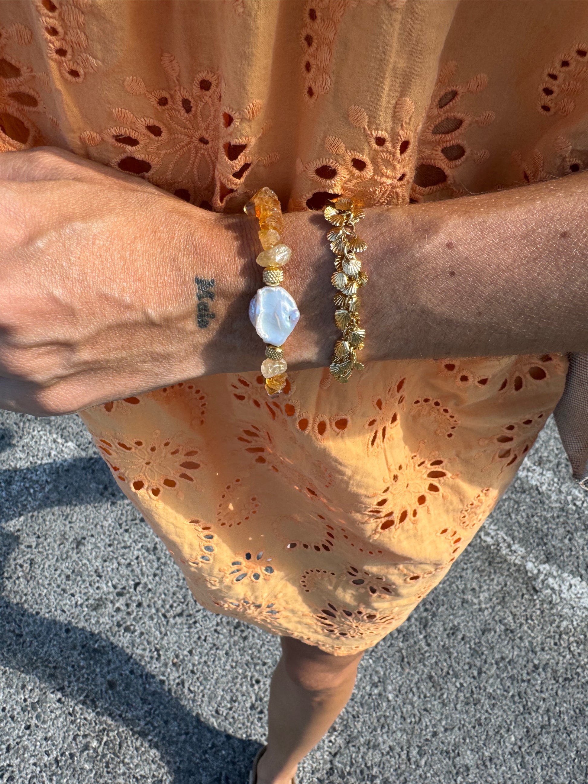 Ce bracelet capture toute la beauté brute de l’océan. Composé de fragments de coquillages blancs soigneusement polis, d’une imposante perle baroque d’eau douce au centre, et de perles dorées en acier inoxydable, il incarne l’esprit marin avec élégance et caractère.