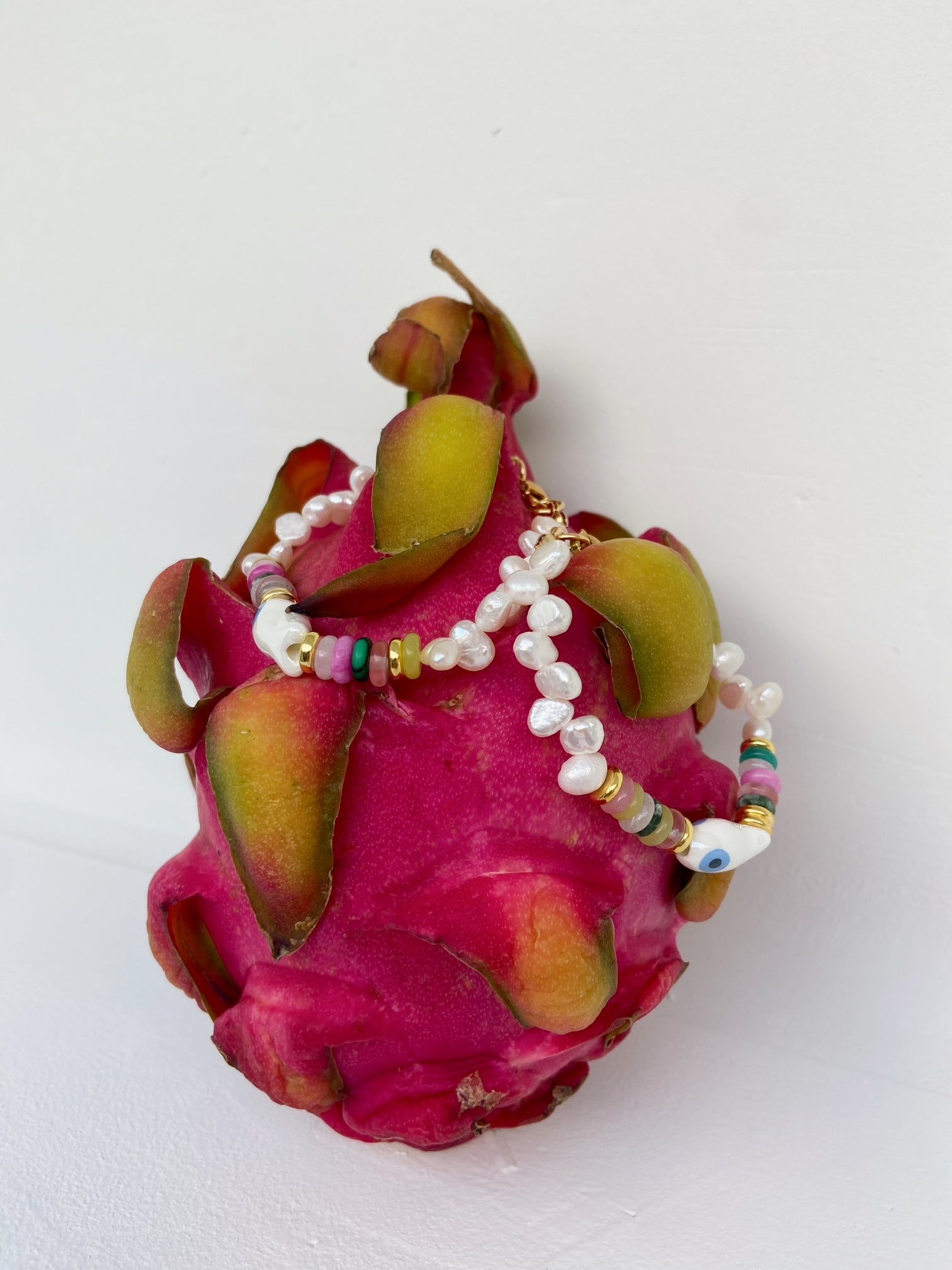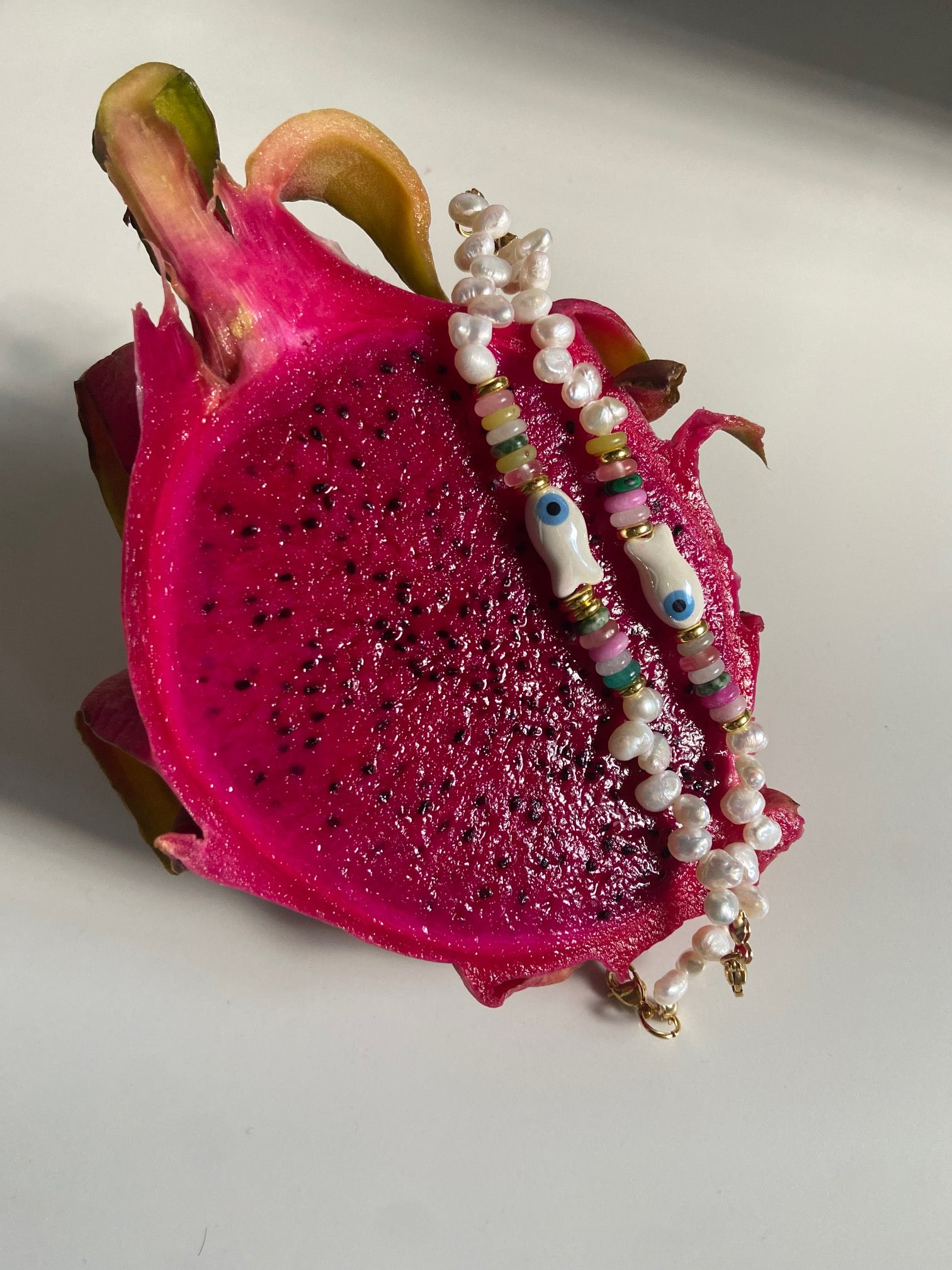 Deux bracelets en perles d'eau douce et perles colorées, unis par l'amour d'une mère et sa fille, comme un lien de tendresse et de protection éternelle.