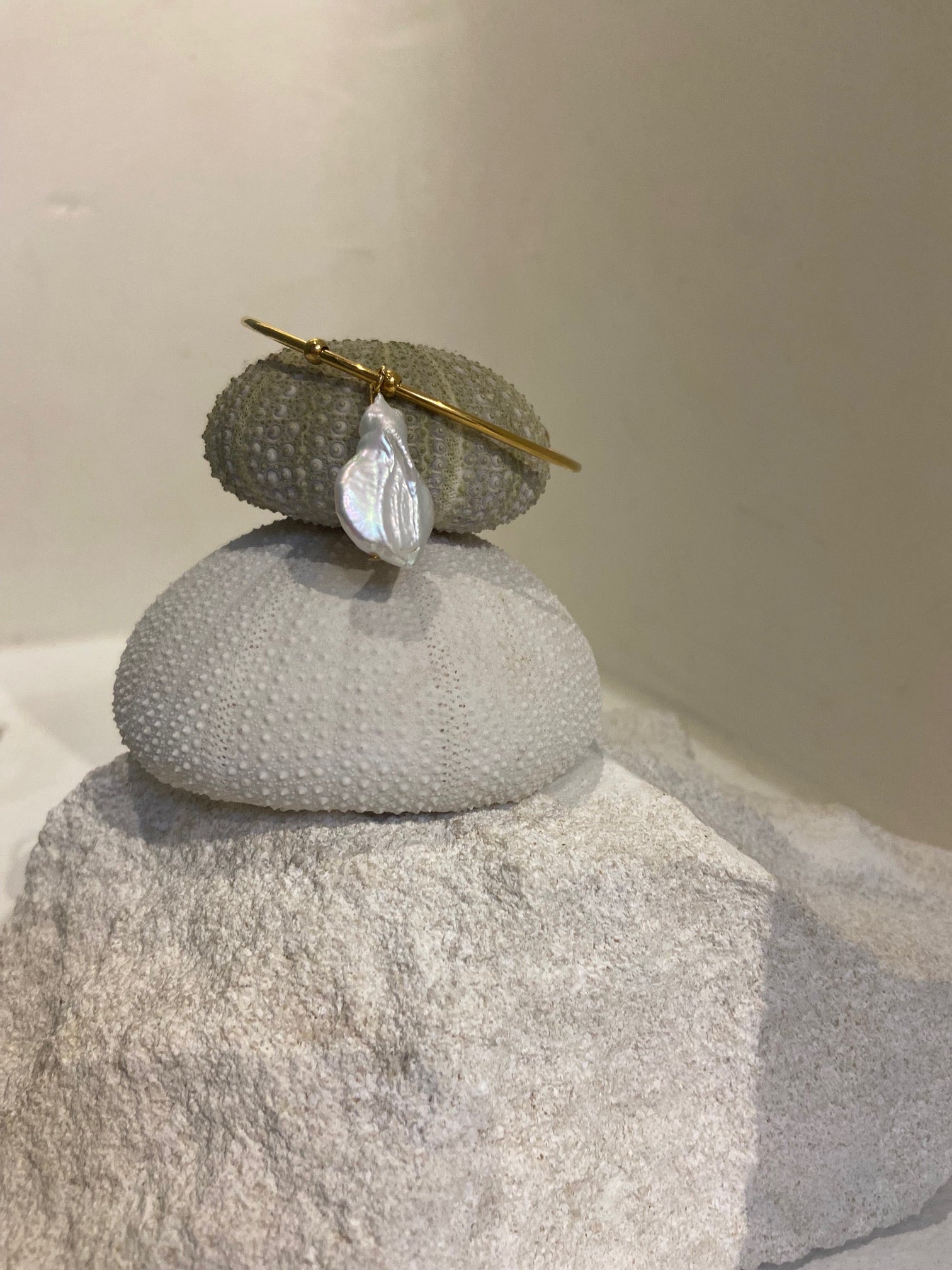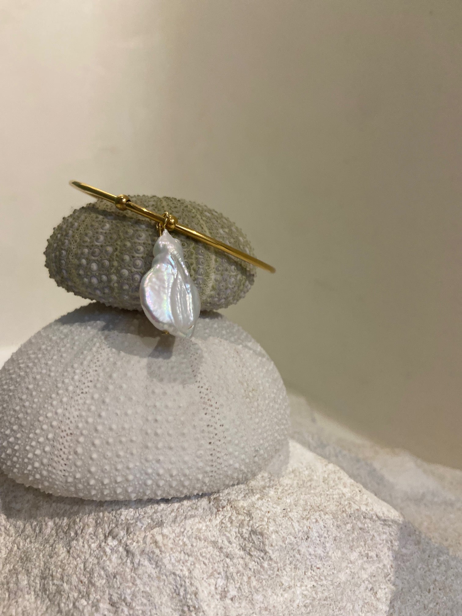 Bracelet épuré en jonc (anneaux ouvert modulable) sublimé d'un pendentif discret en perle d'eau douce baroque.