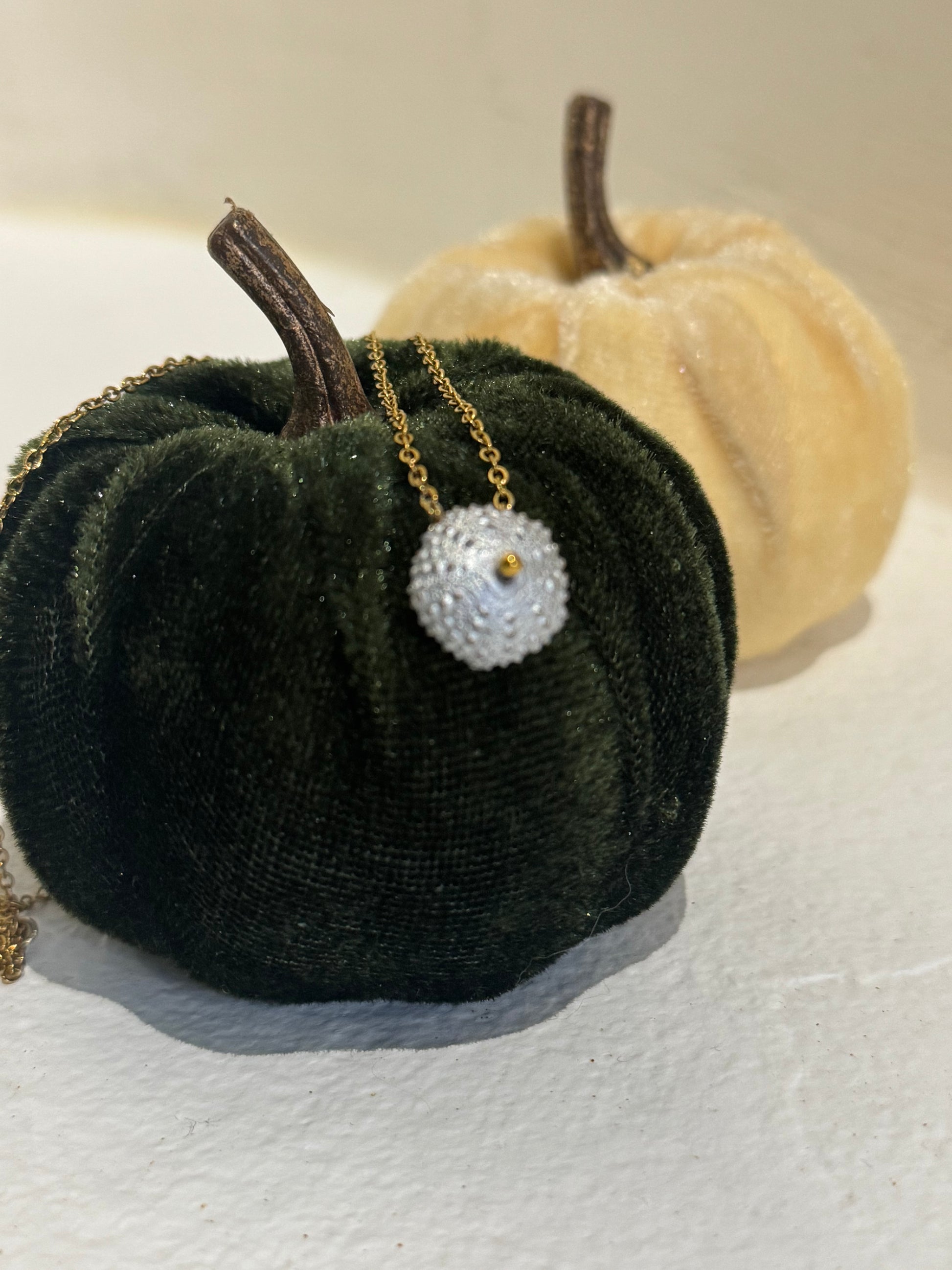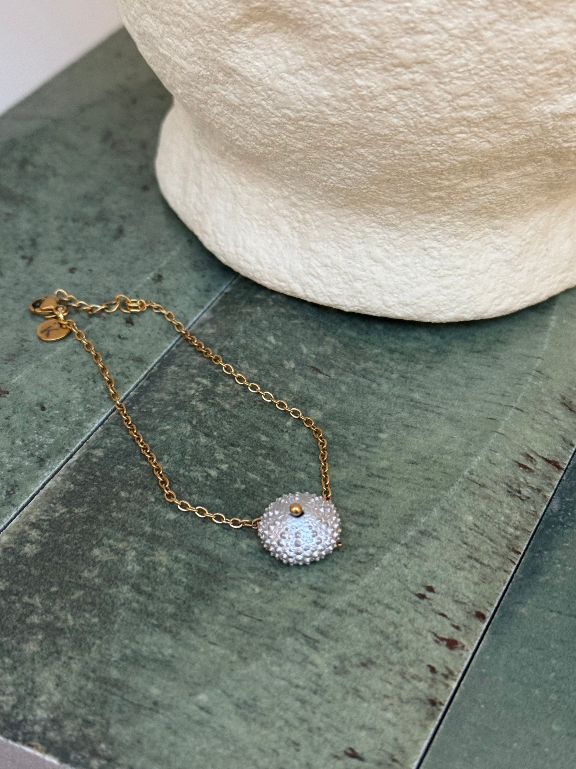 Chaque oursin, soigneusement sélectionné pour sa forme et sa texture, est une pièce unique, rendant chaque bracelet singulier. Le contraste entre la douce patine dorée et le blanc nacré de l’oursin crée un bijou à la fois poétique et contemporain.
