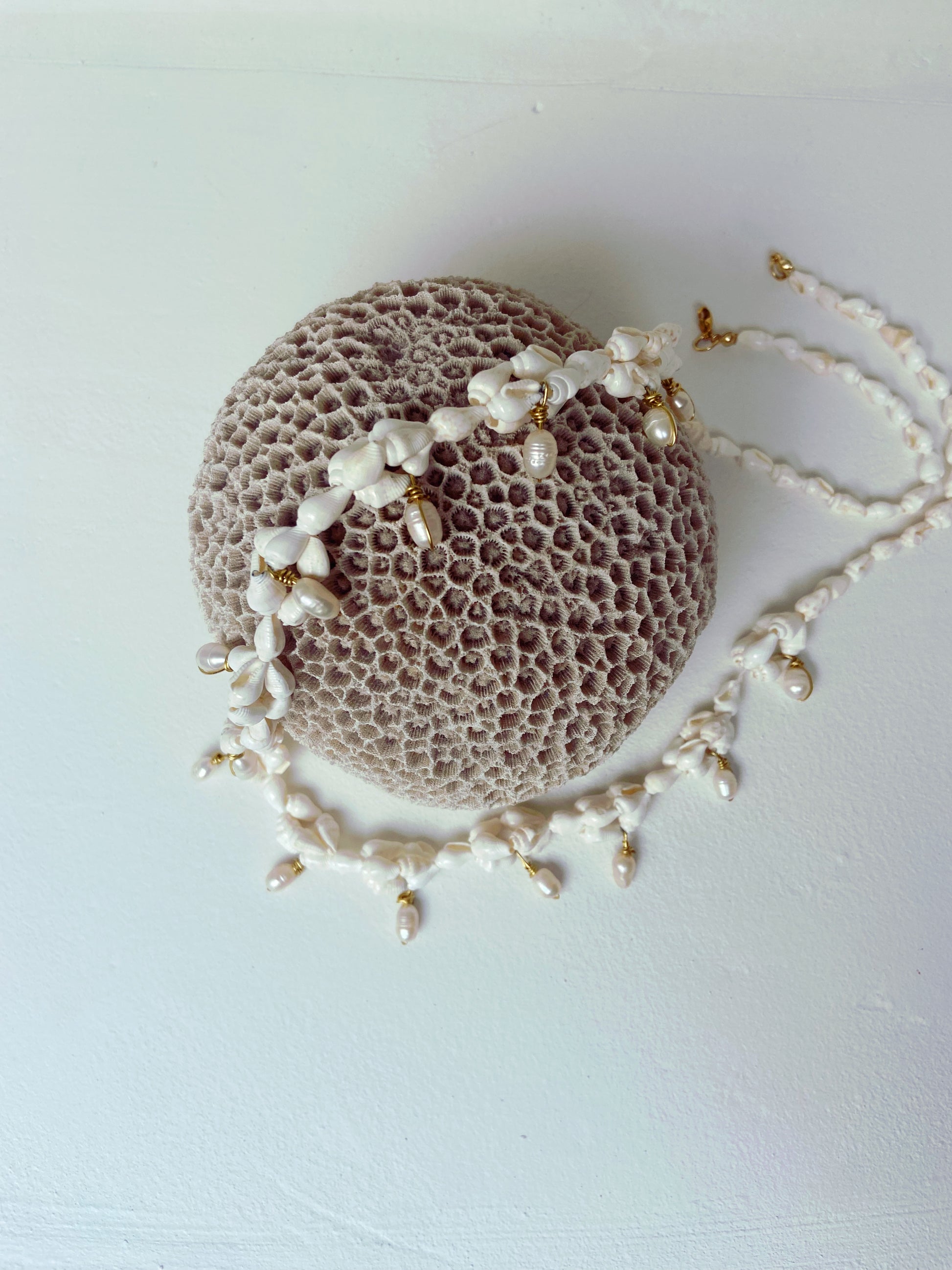 Ce collier qui évoque les trésors cachés des fonds marins, en perles blanches d'eau douce et coquillages, conjugue avec délicatesse la sophistication et la poésie d'un bijou d'exception