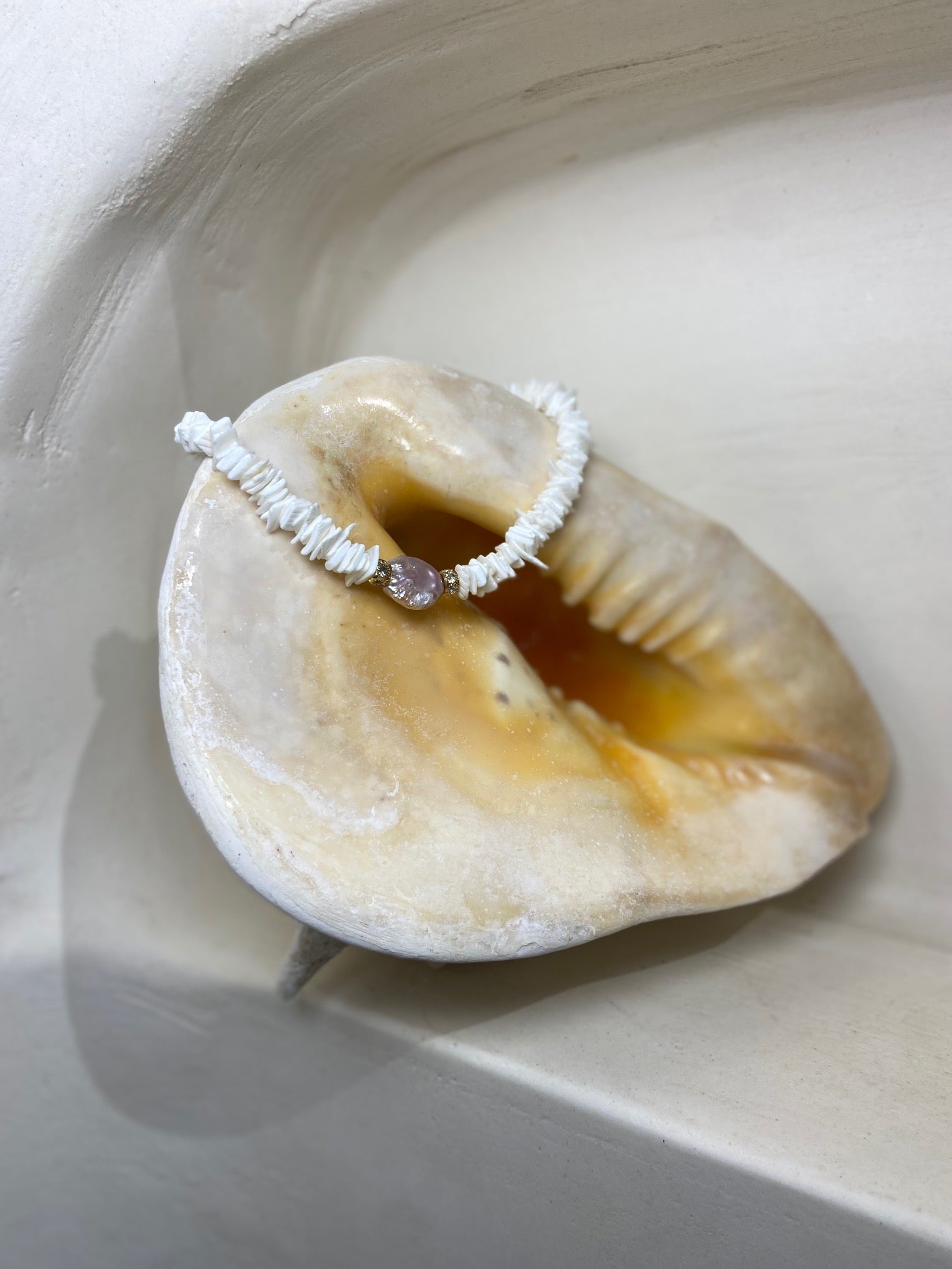 Ce collier Délicat marie avec grâce des morceaux de coquillages naturels et une jolie perle d'eau douce baroque rose. Dans une harmonie subtile qui évoque la richesse des fonds marins.