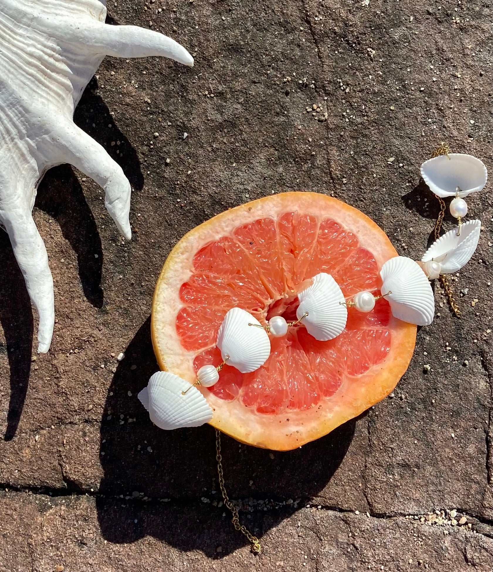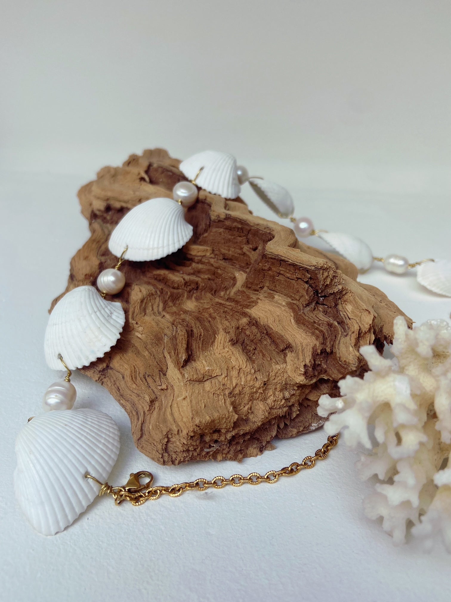 Ce collier sait révéler la puissance en toute simplicité. Il associe de magnifiques coquillages blancs percés avec soin, avec des perles rondes d'eau douce.