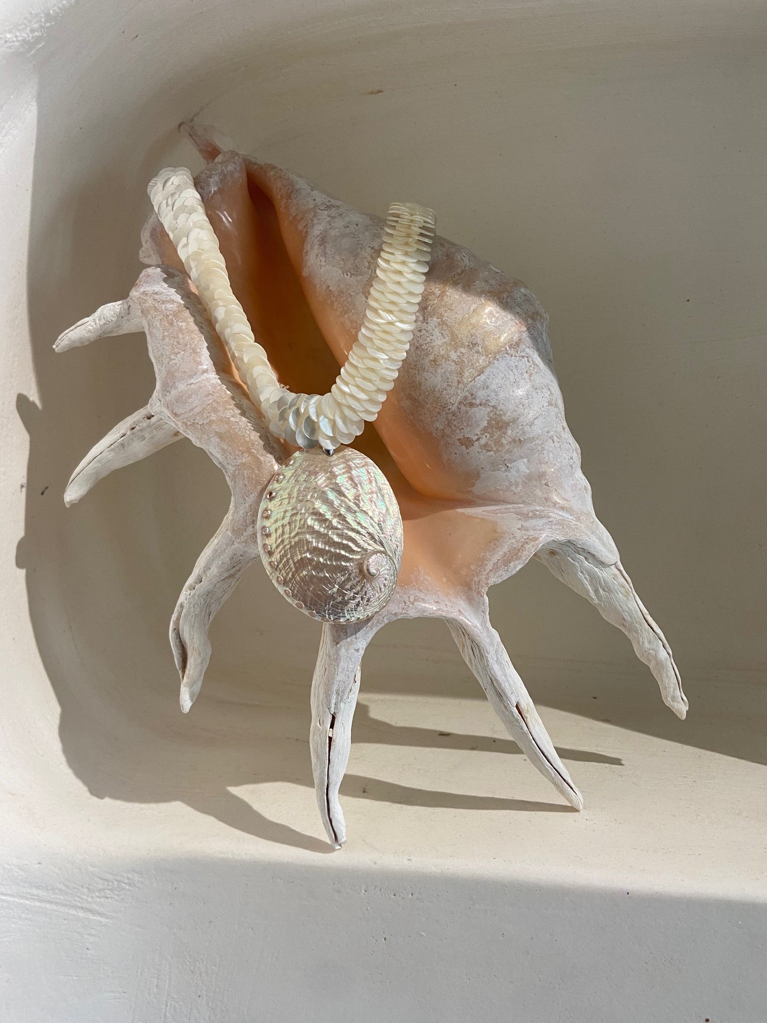 Ce somptueux collier est un véritable voyage. Composé de disques de nacré finement liés ensembles, allié avec un magnifique ormeau, il capture l'essence même des trésors que cache l'océan.