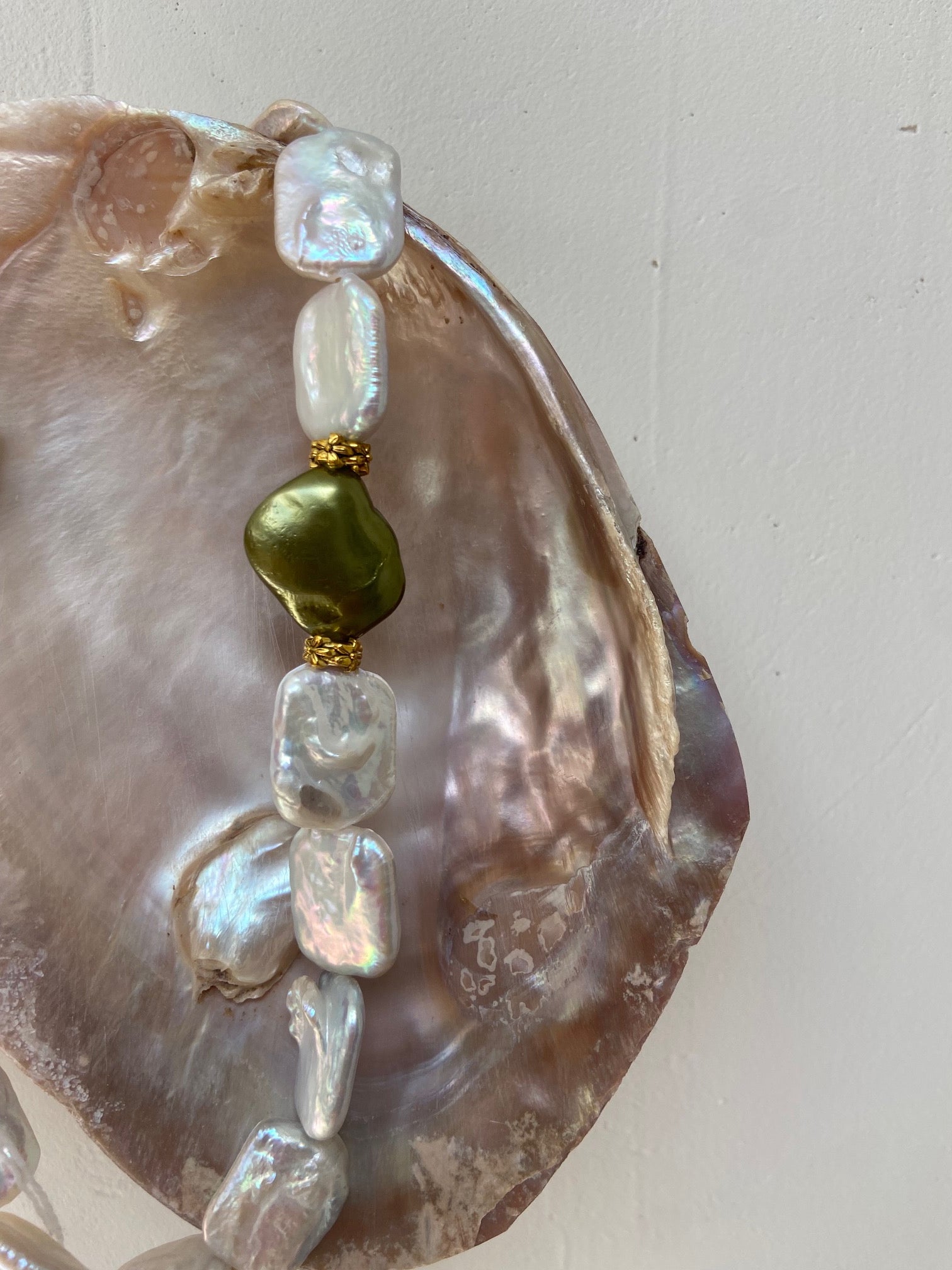 Ce collier ras du cou ( Chocker) est d'une élégance inconsidérable, il allie avec simplicité la perle baroque stricte et carré avec la rondeur et couleur Kaki de la perle de son centre.